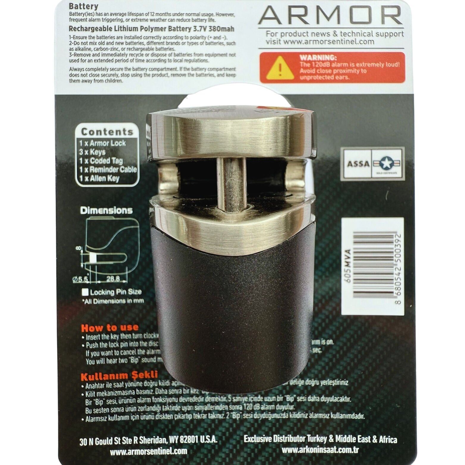 Armor 605MVA 5.5mm 120Db Alarmlı ve Şarjlı Disk Kilidi (Tüm Vespa Modelleriyle Uyumludur)